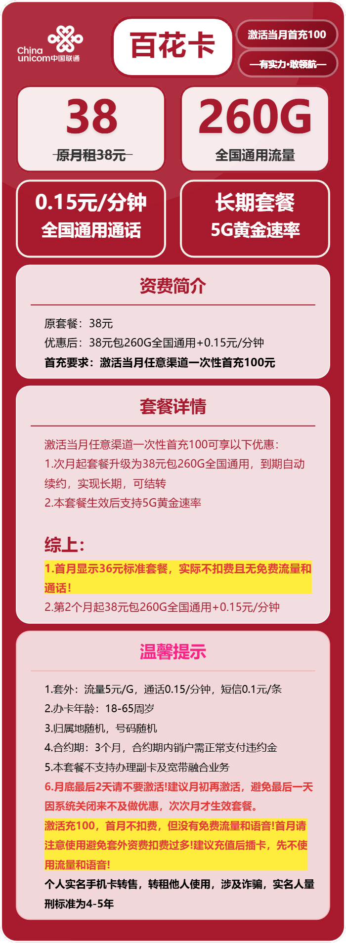 - 优惠后:38元包260G全国通用+0.15元/分钟