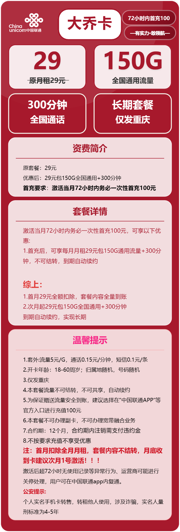 📱宝子们!重庆联通又放大招啦~这张「大乔卡」直接给我香到跺jio!! 💰月租才29块!150G通用流量+300分钟通话直接拉满💥 (不是定向!刷剧/打游戏/视频通话随便造~) ✨重点来咯—— ✅归属地重庆,省内专属(本地宝子冲更稳!) ✅年龄18-25岁,学生党/职场新人闭眼入~ ✅合约12个月,稳稳用一年不亏! ✅快递员直接上门激活,不用跑营业厅超方便🚚 ⚠️划重点:激活后72小时内记得首充100!(任意渠道都行~) 复机也超省心👉联通APP搜“二次实名”或“自主复通”,线下营业厅/10010也能搞定~ 不选号不纠结,流量管够通话自由,这波真的血赚!! 18-25岁的宝子速戳~手慢无啊!!👇 #重庆联通 #流量卡推荐 #学生党必备 #打工人福利 (配图建议:手机卡实拍+流量/通话图标+可爱表情包) 💌小贴士:有问题评论区戳我,帮你解答~