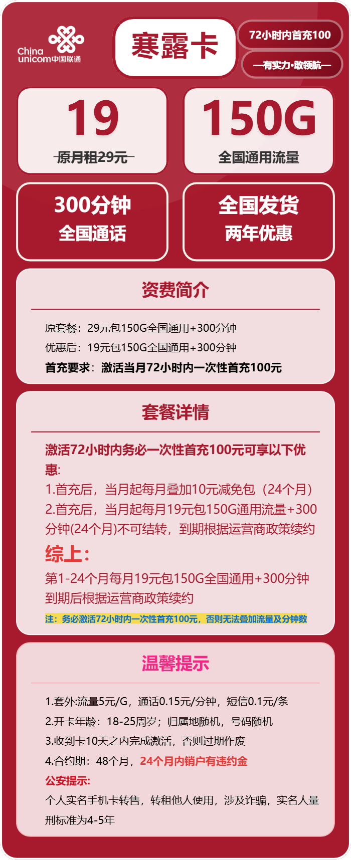 联通寒露卡是中国联通官方推出的高性价比流量卡,官方运营商手机卡,非物联卡。中国联通APP可查套餐。低资费,超大流量!正规联通手机卡,可共享热点流量。免费包邮到家,随时下架。