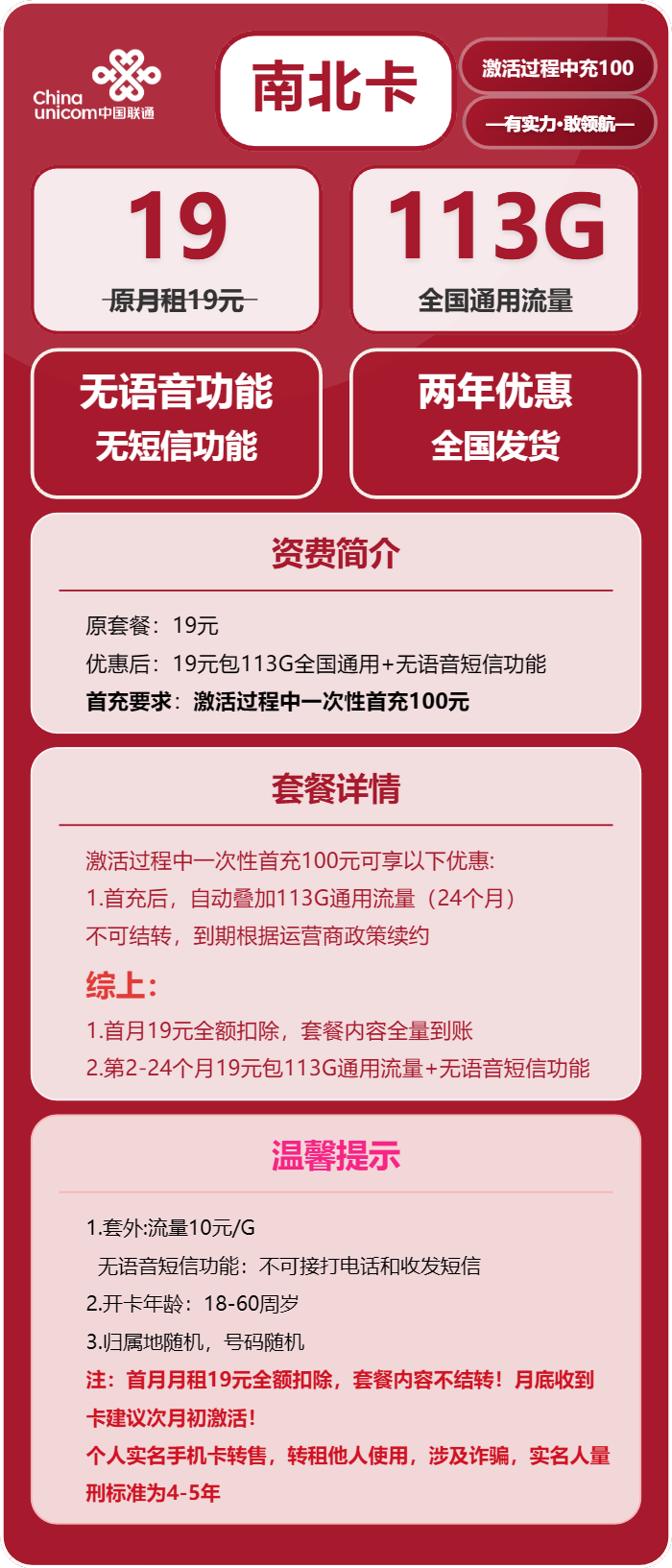 📢流量党狂喜!19元拿下113G通用流量的快乐谁懂!📢 联通【南北卡】杀疯了!💰19元=113G通用流量📶(无语音需求直接冲!) 归属地随机不用选号,快递🚚送到家,自己激活🔑超easy~ 18-60岁都能办,24个月合约稳稳当当~ 激活当月记得一次性首充100元哦💰(流量直接到账!) 复机超方便:联通APP搜“二次实名/自主复通”按提示操作,或者线下营业厅/10010,3步搞定! 无语音刚需的学生党、上班族、追剧党闭眼入!这种性价比错过拍大腿!🚀 #流量自由 #联通神卡 #19元113G #薅羊毛日常 (PS:随机归属地不影响使用,快递到家即享大流量~戳我了解更多!)