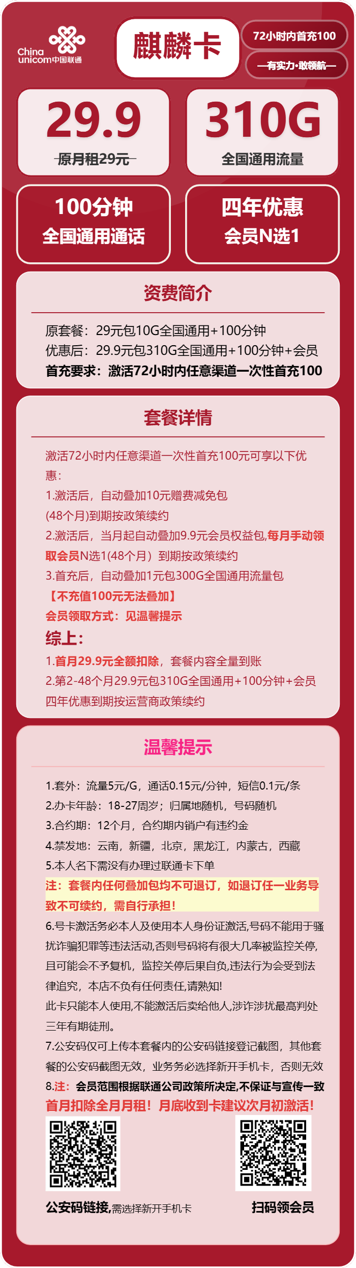 联通麒麟卡是中国联通官方推出的高性价比流量卡,官方运营商手机卡,非物联卡。中国联通APP可查套餐。低资费,超大流量!正规联通手机卡,可共享热点流量。免费包邮到家,随时下架。