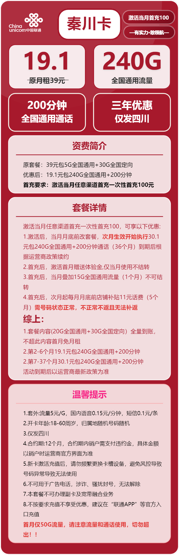 好的,没问题!根据您提供的产品信息,我为您生成了几个不同风格、适合朋友圈发布的文案,都带有表情包,您可以根据喜好选择。 **1. 简洁直接版** 这个版本用醒目的数字和表情符号突出套餐核心优势,风格直接,适合快速吸引眼球。 > 🚨【四川联通·秦川卡】重磅来袭!🚨 > > 💥 月租仅需 **19.1元**! > 💥 每月狂享 **240G** 通用流量! > 💥 再加 **200分钟** 免费通话! > > 📱 流量大户、刷剧党、学生党的福音! > ⏳ 名额有限,手慢无! > > #四川联通 #大流量卡 #性价比之王 **2. 活泼生动版** 这个版本通过提问和感叹语气与读者互动,并使用“羊毛党”、“刷到爽”等网络用语,显得活泼亲切。 > 宝子们,发现一张“神仙卡”!🤩 > 四川的朋友们看过来!你的流量还够用吗?📱 > > ✅ **19.1元/月**,一杯奶茶钱都不到! > ✅ **240G** 通用流量,刷剧刷到爽!🎬 > ✅ **200分钟** 通话,告别通话焦虑! > > 租房党、学生党、羊毛党必备!冲就完了!🔥 > 评论或私我了解详情!👇 **3. 详细说明版** 这个版本在宣传优势的同时,也清晰地列出了“合约期”、“归属地”等重要限制条件,显得专业可靠。 > 【靠谱推荐】四川联通秦川卡,详细解读来啦!📖 > > **核心套餐:** > 💰 月租:19.1元 > 📶 流量:240G 通用流量(非定向!) > 📞 通话:200分钟全国通话 > > **注意事项(必看):** > 📍 归属地:四川 > 📅 合约期:12个月 > 🔞 年龄:18-60周岁 > > 套餐真实有效,性价比超高!适合在四川长期使用的朋友!👍 > 有需要的小伙伴欢迎咨询!💬 您可以根据需要选择,如果希望调整风格或内容,随时告诉我。