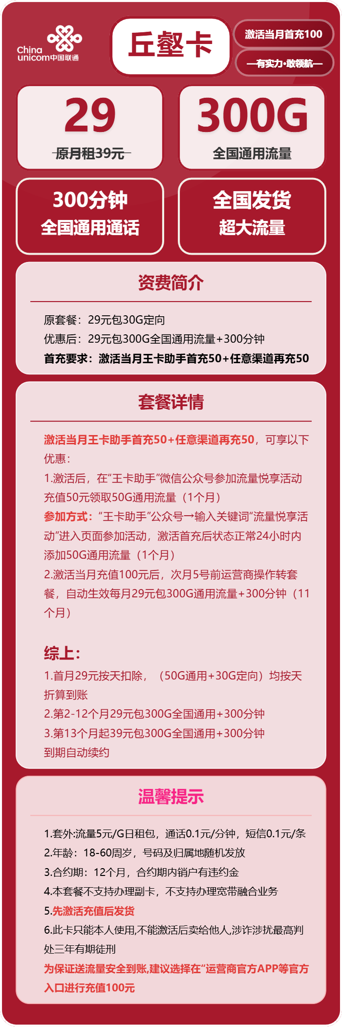 优惠后:29元包300G全国通用流量+300分钟