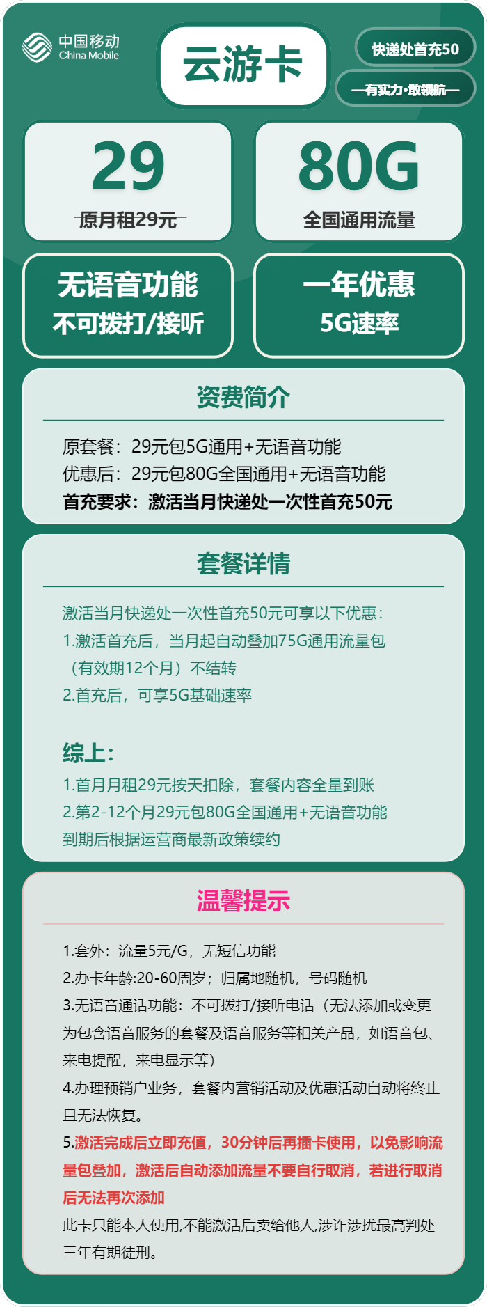 家人们👋!我最近办理了一张超划算的移动云游卡😎!29 元就可以包 50G 通用流量+30G 定向流量呢,而且没有语音功能哦~归属地是随机的,配送方式是超快速的顺丰哦~年龄限制在 18 - 60 周岁呢,套餐合约是 12 个月哒~开卡方式超方便,直接快递员上门激活就行啦,复机也可以拨打 10086 哦~首充渠道也很简单,激活当月任意渠道首充 100 就好啦~最重要的是,不用选号哦,也不是省内的呢~真的是太棒啦!#移动云游卡 #流量卡 #划算套餐
